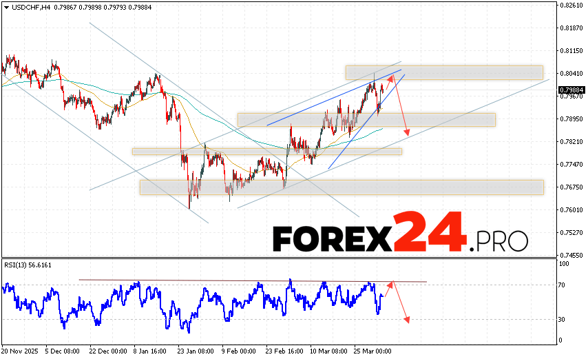 USD/CHF Forecast Dollar Franc for April 3, 2026 suggests an attempt to develop a bullish correction and test the resistance area near 0.8015. Subsequently, the USD/CHF currency pair is expected to continue to decline with a target below 0.7835. A rebound from the trend line on the relative strength indicator (RSI) would be an additional signal in favor of a decline in the USD/CHF pair. A strong rally and a breakout of 0.8125 would cancel the downward scenario. This would indicate a breakout of the resistance level and continued growth with a potential target above 0.8305.