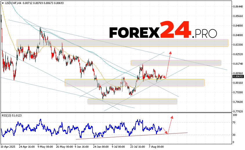 USD/CHF Forecast Dollar Franc for August 19, 2025 suggests an attempt to develop a bearish correction and test the support area near the level of 0.8055. Further, the continuation of the growth of the USD/CHF currency pair with a target above the level of 0.8255. An additional signal in favor of the rise of the Dollar Franc pair will be a rebound from the trend line on the relative strength indicator. The cancellation of the growth option will be a fall and a breakout of the 0.7975 area. This will indicate a breakout of the support level and a continuation of the fall of the pair with a potential target below the level of 0.7795.