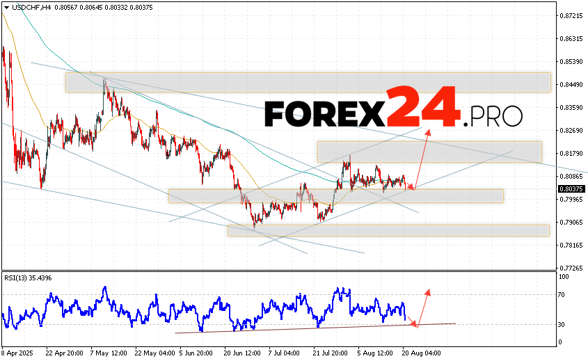 USD/CHF Forecast Dollar Franc for August 21, 2025 suggests an attempt to develop a bearish correction and test the support area near the level of 0.8005. Further, the continuation of the growth of the USD/CHF currency pair with a target above the level of 0.8265. An additional signal in favor of the rise of the Dollar Franc pair will be a rebound from the trend line on the relative strength indicator. The cancellation of the growth option will be a fall and a breakout of the 0.7975 area. This will indicate a breakout of the support level and a continuation of the fall of the pair with a potential target below the level of 0.7765.