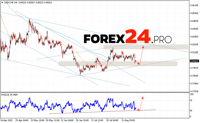 USD/CHF Forecast Dollar Franc for August 26, 2025 suggests an attempt to develop a bearish correction and test the support area near the level of 0.7965. Further, the continuation of the growth of the USD/CHF currency pair with a target above the level of 0.8285. An additional signal in favor of the rise of the Dollar Franc pair will be a rebound from the trend line on the relative strength indicator. The cancellation of the growth option will be a fall and a breakout of the 0.7975 area. This will indicate a breakout of the support level and a continuation of the fall of the pair with a potential target below the level of 0.7765.