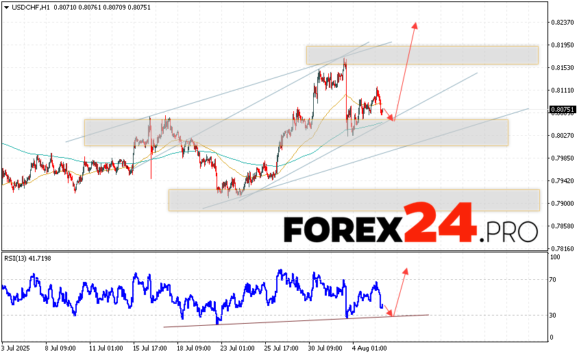 USD/CHF Forecast Dollar Franc for August 6, 2025 suggests an attempt at a bearish correction and a test of the support area near the 0.8055 level. Further, the USD/CHF currency pair will continue to grow with a target above the 0.8235 level. An additional signal in favor of the rise of the Dollar-Franc pair will be a rebound from the trend line on the relative strength indicator. A fall and breakout of the 0.7995 area will cancel the growth scenario. This will indicate a breakout of the support level and a continuation of the pair’s decline with a potential target below the 0.7735 level.