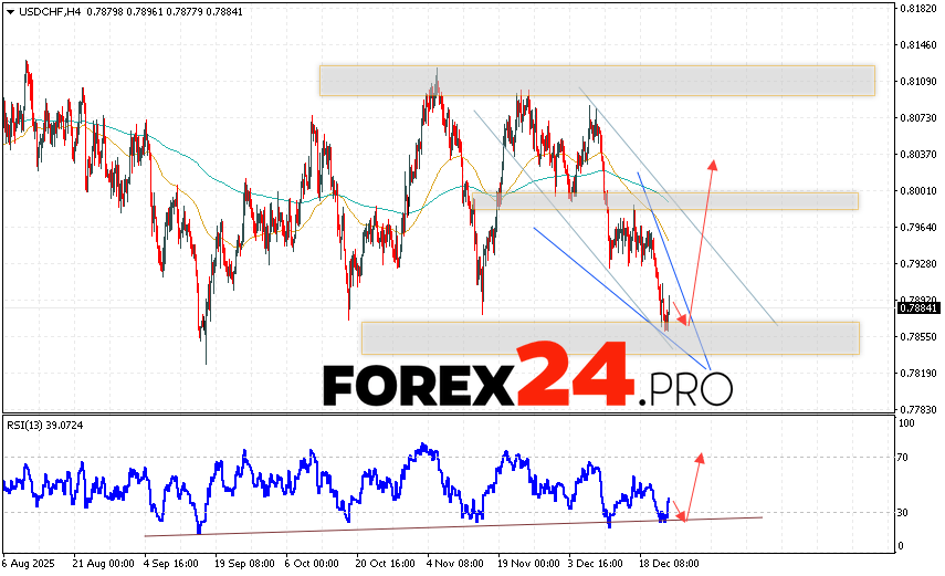 USD/CHF Forecast Dollar Franc for December 26, 2025 suggests an attempt to develop a bearish correction and test the support area near 0.7875. Further growth is then expected in the USD/CHF currency pair, with a target above 0.8045. A rebound from the trend line on the relative strength indicator (RSI) would be an additional signal in favor of an upside move. A decline and a breakout of 0.7805 would cancel out the upside move. This would indicate a breakout of the support level and a continued decline in the pair, with a potential target below 0.7665.