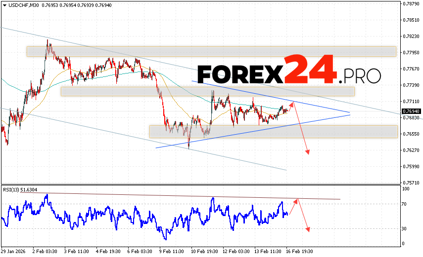USD/CHF Forecast Dollar Franc for February 17, 2026 suggests an attempt to develop a bullish correction and test the resistance area near 0.7705. Further decline in the USD/CHF currency pair is then expected, with a target below 0.7625. A rebound from the trend line on the relative strength indicator (RSI) would be an additional signal for a decline in the USD/CHF pair. A strong rally and a breakout of 0.7755 would cancel out the downside scenario. This would indicate a breakout of the resistance level and continued growth, with a potential target above 0.7885.