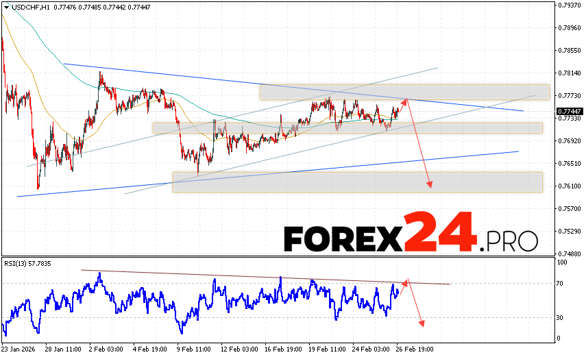 USD/CHF Forecast Dollar Franc for February 27, 2026 suggests an attempt to develop a bullish correction and test the resistance area near 0.7755. Further decline in the USD/CHF currency pair is then expected, with a target below 0.7595. An additional signal supporting a decline in the USD/CHF pair would be a rebound from the trend line on the relative strength indicator. A strong rally and a breakout of 0.7825 would cancel the downside scenario. This would indicate a breakout of the resistance level and continued growth, with a potential target above 0.7975.