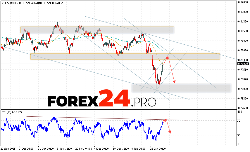 USD/CHF Forecast Dollar Franc for February 3, 2026 suggests an attempt to continue the rise and test the resistance area near 0.7835. Subsequently, the USD/CHF currency pair is expected to continue to decline, with a target below 0.7655. An additional signal supporting a decline in the USD/CHF pair would be a rebound from the trend line on the relative strength indicator. A strong rally and a breakout of 0.7945 would cancel the downside scenario. This would indicate a breakout of the resistance level and a continued rise in the pair, with a potential target above 0.7995.