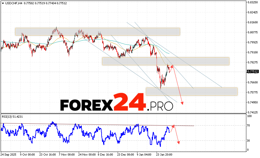 USD/CHF Forecast Dollar Franc for February 4, 2026 suggests an attempt to continue the rally and test the resistance area near 0.7775. Subsequently, the USD/CHF currency pair is expected to continue to decline, with a target below 0.7495. A rebound from the trend line on the relative strength indicator (RSI) would be an additional signal for a decline in the USD/CHF pair. A strong rally and a breakout of 0.7905 would cancel the downside scenario. This would indicate a breakout of the resistance level and a continued rally, with a potential target above 0.8165.