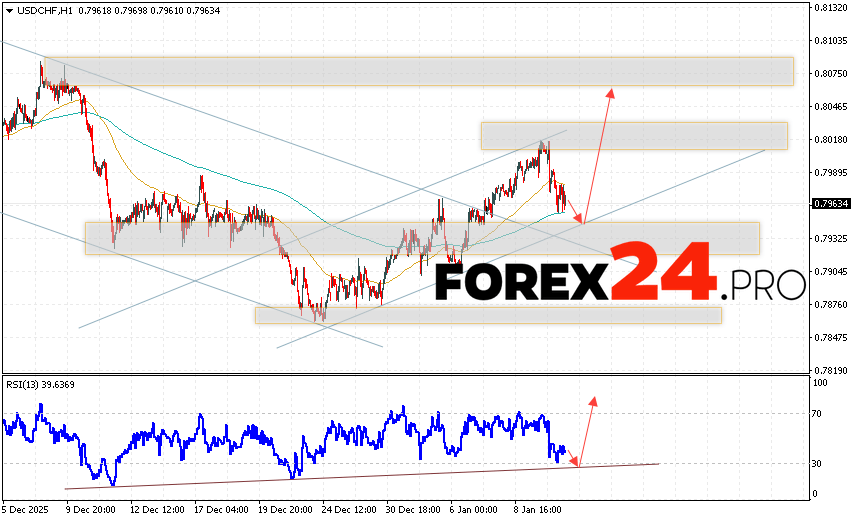 USD/CHF Forecast Dollar Franc for January 13, 2026 suggests an attempt to extend the decline and test the support area near 0.7935. Further growth is expected for the USD/CHF pair, with a target above 0.8075. A rebound from the trend line on the relative strength indicator (RSI) would be an additional signal in favor of an uptrend. A decline and a breakout of 0.7915 would cancel out the uptrend. This would indicate a breakout of the support level and continued decline, with a potential target below 0.7685.