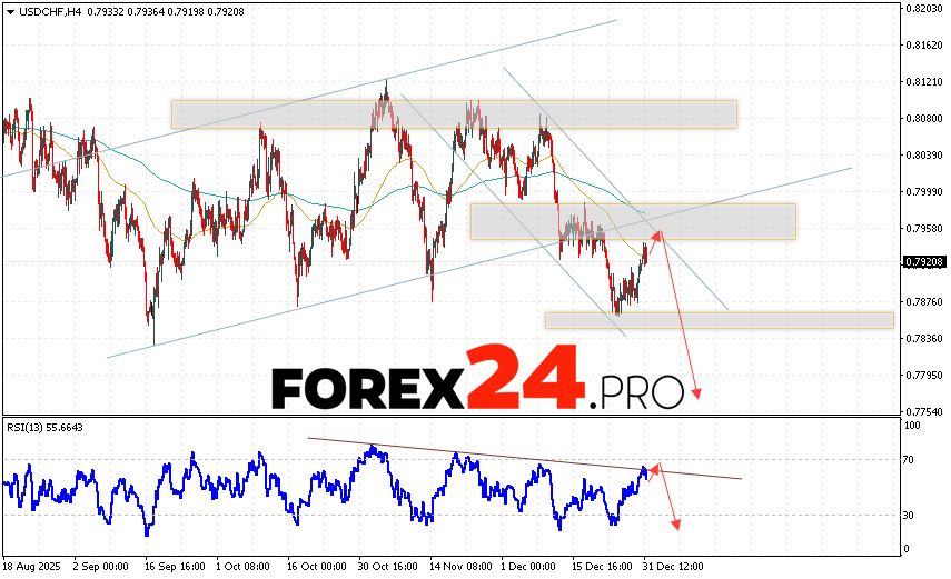 USD/CHF Forecast Dollar Franc for January 2, 2026 suggests an attempt to develop a bullish correction and test the resistance area near 0.7945. Subsequently, the USD/CHF currency pair is expected to continue to decline with a target below 0.7765. An additional signal supporting a decline in the USD/CHF pair would be a rebound from the trend line on the relative strength indicator. A strong rally and a breakout of 0.7995 would cancel the downward trend. This would indicate a breakout of the resistance level and continued growth in the pair with a potential target above 0.8165.