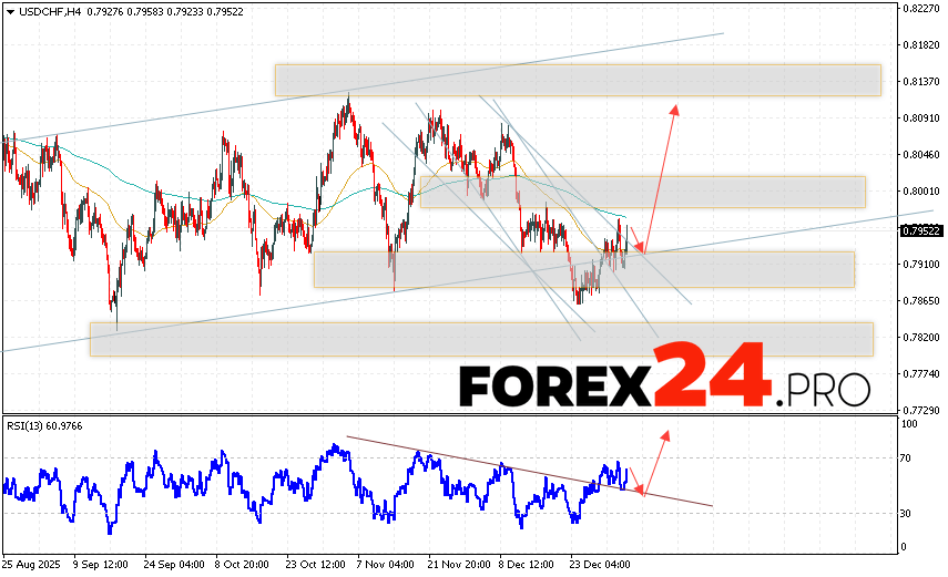 USD/CHF Forecast Dollar Franc for January 7, 2026 suggests an attempt to extend the decline and test the support area near 0.7915. Subsequently, the USD/CHF currency pair is expected to continue to rise with a target above 0.8095. An additional signal in favor of an uptrend for the USD/CHF pair would be a rebound from the trend line on the relative strength indicator. A decline and a breakout of 0.7885 would cancel out the uptrend. This would indicate a breakout of the support level and a continued decline in the pair with a potential target below 0.7645.