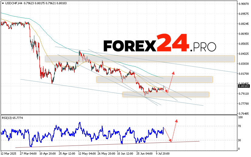 USD/CHF Forecast Dollar Franc for July 16, 2025 suggests an attempt at a bearish correction and a test of the support area near the 0.7965 level. Further, the USD/CHF currency pair will continue to grow with a target above the 0.8165 level. An additional signal in favor of the rise of the Dollar-Franc pair will be a rebound from the trend line on the relative strength indicator. A fall and breakout of the 0.7905 area will cancel the growth scenario. This will indicate a breakout of the support level and a continuation of the pair’s decline with a potential target below the 0.7725 level.