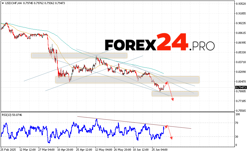 USD/CHF Forecast Dollar Franc for July 4, 2025 suggests an attempt to develop a bullish correction and test the resistance area near the level of 0.8045. Next, the USD/CHF currency pair continues to fall with a target below 0.7735. An additional signal in favor of a decline in the Dollar/Franc pair will be a rebound from the trend line on the relative strength indicator. The cancellation of the fall option will be a strong growth and a breakout of the 0.8135 area. This will indicate a breakout of the resistance level and continued growth of the pair with a potential target above 0.8275.