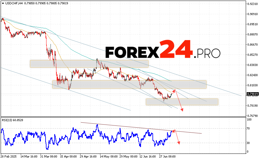 USD/CHF Forecast Dollar Franc for July 8, 2025 suggests an attempt to develop a bullish correction and test the resistance area near the level of 0.8035. Further, the continuation of the USD/CHF currency pair decline with a target below the level of 0.7745. An additional signal in favor of the decline in the pair Dollar-Frank will be a rebound from the trend line on the relative strength indicator. A strong growth and breakdown of the 0.8145 area will cancel the downside option. This will indicate the breakdown of the resistance level and the continuation of the pair growth with a potential target above 0.8285.