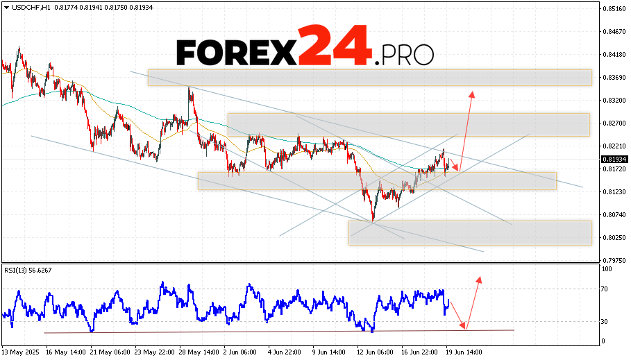 USD/CHF Forecast Dollar Franc for June 20, 2025 suggests an attempt to develop a correction and test the support area near the 0.8165 level. Further, the USD/CHF currency pair will continue to grow with a target above the 0.8345 level. An additional signal in favor of the rise of the Dollar-Franc pair will be a rebound from the trend line on the relative strength indicator. A fall and breakout of the 0.8105 area will cancel the growth scenario. This will indicate a breakout of the support level and a continuation of the pair’s decline with a potential target below the 0.7825 level.
