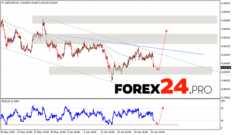 USD/CHF Forecast Dollar Franc for June 24, 2025 suggests an attempt to develop a correction and test the support area near the 0.8105 level. Further, the USD/CHF currency pair will continue to grow with a target above the 0.8335 level. An additional signal in favor of the rise of the Dollar-Franc pair will be a rebound from the trend line on the relative strength indicator. A fall and breakout of the 0.7985 area will cancel the growth scenario. This will indicate a breakout of the support level and a continuation of the pair’s decline with a potential target below the 0.7725 level.