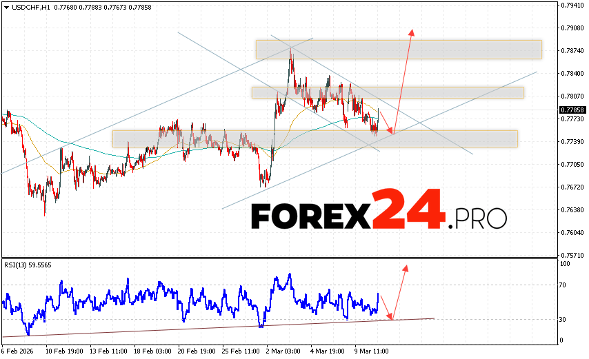 USD/CHF Forecast Dollar Franc for March 11, 2026 suggests an attempt to develop a bearish correction and test the support area near 0.7745. Further growth in the USD/CHF currency pair is then expected, with a target above 0.7905. A rebound from the trend line on the relative strength indicator (RSI) would be an additional signal in favor of growth. A decline and a breakout of 0.7695 would cancel the upward trend. This would indicate a breakout of the support level and a continued decline in the pair, with a potential target below 0.7455.
