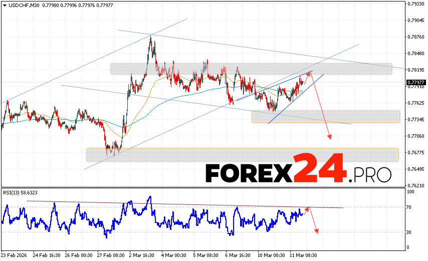 USD/CHF Forecast Dollar Franc for March 12, 2026 suggests an attempt to develop a bullish correction and test the resistance area near 0.7815. Further decline in the USD/CHF currency pair is expected, with a target below 0.7725. A rebound from the trend line on the relative strength indicator (RSI) would be an additional signal in favor of a decline in the USD/CHF pair. A strong rally and a breakout of 0.7905 would cancel the downward scenario. This would indicate a breakout of the resistance level and continued growth, with a potential target above 0.8065.