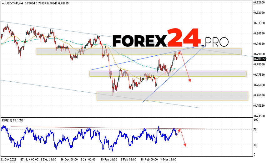 USD/CHF Forecast Dollar Franc for March 17, 2026 suggests an attempt to develop a bullish correction and test the resistance area near 0.7905. Further decline in the USD/CHF currency pair is then expected, with a target below 0.7725. A rebound from the trend line on the relative strength indicator (RSI) would be an additional signal in favor of a decline in the USD/CHF pair. A strong rally and a breakout of 0.7975 would cancel the downward scenario. This would indicate a breakout of the resistance level and continued growth, with a potential target above 0.8165.