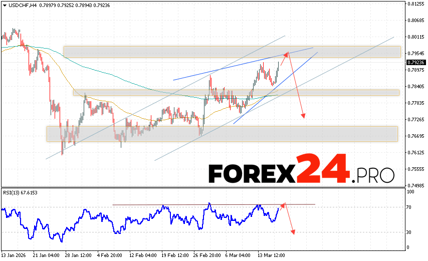 USD/CHF Forecast Dollar Franc for March 19, 2026 suggests an attempt to develop a bullish correction and test the resistance area near 0.7955. Further decline in the USD/CHF currency pair is expected, with a target below 0.7725. A rebound from the trend line on the relative strength indicator (RSI) would be an additional signal in favor of a decline in the USD/CHF pair. A strong rally and a breakout of 0.8005 would cancel the downward scenario. This would indicate a breakout of the resistance level and continued growth, with a potential target above 0.8225.