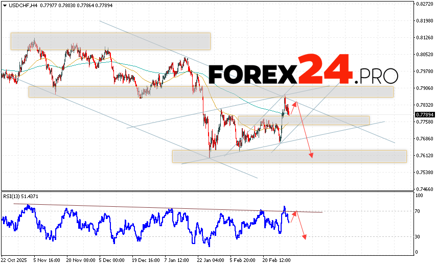 USD/CHF Forecast Dollar Franc for March 5, 2026 suggests an attempt to develop a bullish correction and test the resistance area near 0.7835. Further decline in the USD/CHF currency pair is then expected, with a target below 0.7625. A rebound from the trend line on the relative strength indicator (RSI) would be an additional signal for a decline in the USD/CHF pair. A strong rally and a breakout of 0.7955 would cancel out the downside scenario. This would indicate a breakout of the resistance level and continued growth, with a potential target above 0.8225.