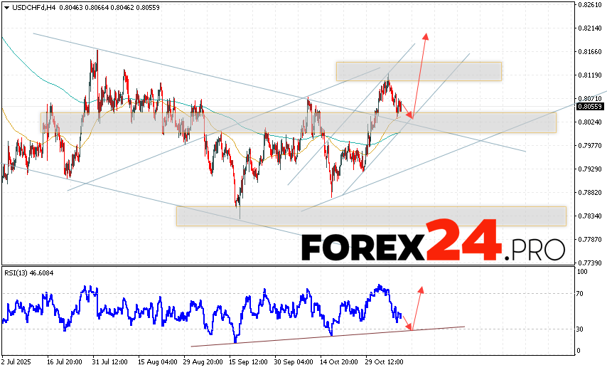 USD/CHF Forecast Dollar Franc for November 11, 2025 suggests an attempt to develop a bearish correction and test the support area near 0.8025. Further growth is then expected in the USD/CHF currency pair, with a target above 0.8215. A rebound from the trend line on the relative strength indicator (RSI) would be an additional signal in favor of an uptrend. A decline and a breakout of 0.7975 would cancel out the uptrend. This would indicate a breakout of the support level and continued decline in the pair, with a potential target below 0.7745.
