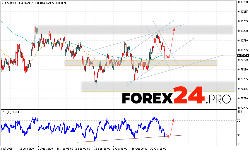 USD/CHF Forecast Dollar Franc for November 13, 2025 suggests an attempt to develop a bearish correction and test the support area near 0.7975. Further growth is expected for the USD/CHF pair, with a target above 0.8135. A rebound from the trend line on the relative strength indicator (RSI) would be an additional signal in favor of an upside move. A decline and a breakout of 0.7915 would cancel out the upside scenario. This would indicate a breakout of the support level and a continued decline in the pair, with a potential target below 0.7725.