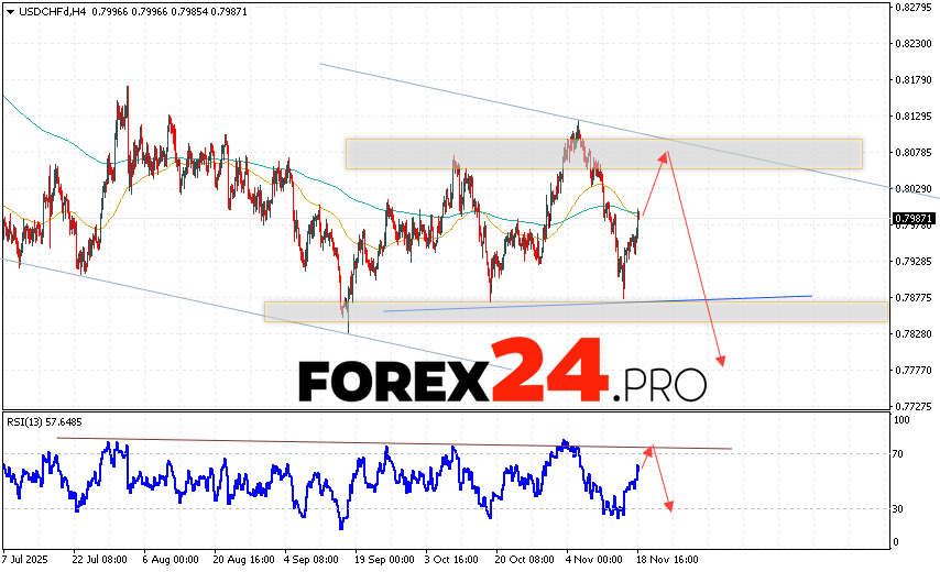 USDCHF Forecast Dollar Franc for November 20, 2025 suggests an attempt to develop a bullish correction and test the resistance area near 0.8075. Further decline in the USD/CHF currency pair is then expected with a target below 0.7775. An additional signal favoring a decline in the USD/CHF pair would be a rebound from the trend line on the relative strength indicator. This downside scenario would be cancelled by a strong rally and a breakout of 0.8155. This will indicate a breakout of the resistance level and continued growth of the pair with a potential target above the level of 0.8315.