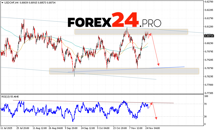 USD/CHF Forecast Dollar Franc for November 26, 2025 suggests an attempt to develop a bullish correction and test the resistance area near 0.8085. Subsequently, the USD/CHF currency pair is expected to continue to decline, with a target below 0.7895. A rebound from the trendline on the relative strength indicator (RSI) would be an additional signal in favor of a decline in the USD/CHF pair. A strong rally and a breakout of 0.8145 would cancel out the downward scenario. This would indicate a breakout of the resistance level and continued growth, with a potential target above 0.8325.