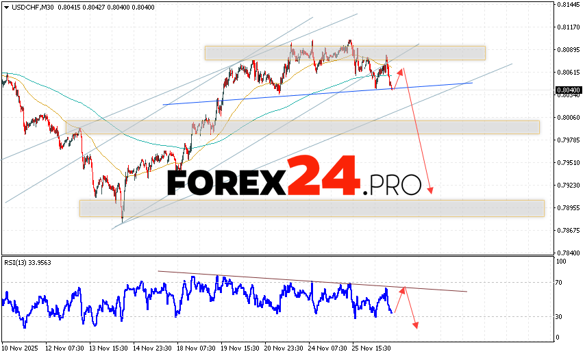 USD/CHF Forecast Dollar Franc for November 27, 2025 suggests an attempt to develop a bullish correction and test the resistance area near 0.8060. Subsequently, the USD/CHF currency pair is expected to continue to decline with a target below 0.7885. An additional signal supporting a decline in the USD/CHF pair would be a rebound from the trend line on the relative strength indicator. A strong rally and a breakout of 0.8135 would cancel out the downside scenario. This would indicate a breakout of the resistance level and continued growth with a potential target above 0.8345.