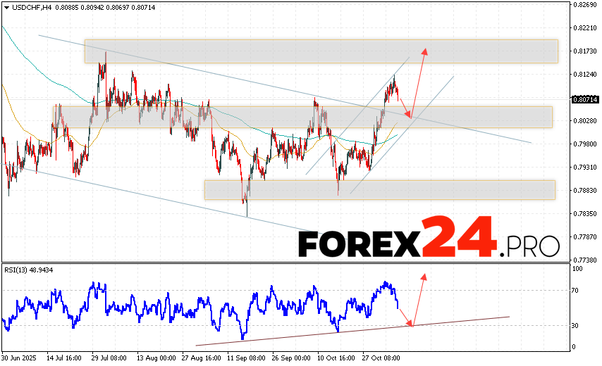USD/CHF Forecast Dollar Franc for November 7, 2025 suggests an attempt to develop a bearish correction and test the support area near 0.8025. Further growth is then expected in the USD/CHF currency pair, with a target above 0.8185. A rebound from the trend line on the relative strength indicator (RSI) would be an additional signal in favor of an uptrend. A decline and a breakout of 0.7975 would cancel out the uptrend. This would indicate a breakout of the support level and continued decline in the pair, with a potential target below 0.7785.