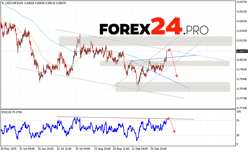 USD/CHF Forecast Dollar Franc for October 10, 2025 suggests an attempt to develop a bullish correction and test the resistance area near 0.8085. Subsequently, the USD/CHF currency pair is expected to continue to decline with a target below 0.7895. An additional signal favoring a decline in the USD/CHF pair would be a rebound from the trend line on the relative strength indicator. A strong rally and a breakout of 0.8125 would cancel this downward scenario. This will indicate a breakout of the resistance level and a continuation of the rise of the pair with a potential target above the level of 0.8345.