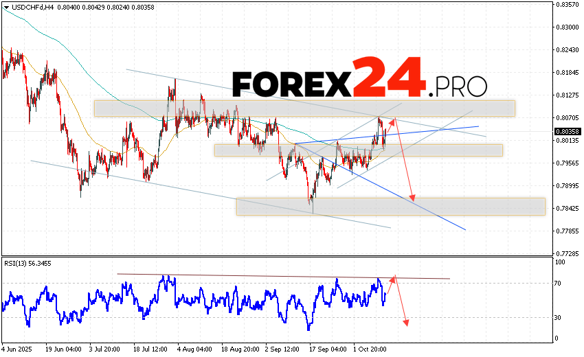 USD/CHF Forecast Dollar Franc for October 14, 2025 suggests an attempt to develop a bullish correction and test the resistance area near 0.8065. Subsequently, the USD/CHF currency pair is expected to continue to decline with a target below 0.7865. An additional signal favoring a decline in the USD/CHF pair would be a rebound from the trend line on the relative strength indicator. A strong rally and a breakout of 0.8125 would cancel out the downward scenario. This will indicate a breakout of the resistance level and a continuation of the rise of the pair with a potential target above the level of 0.8345.