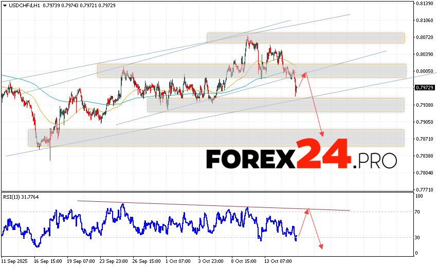 USD/CHF Forecast Dollar Franc for October 16, 2025 suggests an attempt to develop a bullish correction and test the resistance area near 0.7985. Subsequently, the USD/CHF currency pair is expected to continue to decline with a target below 0.7885. An additional signal supporting a decline in the USD/CHF pair would be a rebound from the trend line on the relative strength indicator. A strong rally and a breakout of 0.8065 would cancel the downward trend. This would indicate a breakout of the resistance level and continued growth in the pair with a potential target above 0.8245.