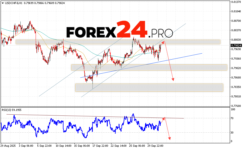 USD/CHF Forecast Dollar Franc for October 2, 2025 suggests an attempt to develop a bullish correction and test the resistance area near 0.8005. Subsequently, the USD/CHF currency pair is expected to continue to decline with a target below 0.7865. An additional signal favoring a decline in the USD/CHF pair would be a rebound from the trend line on the relative strength indicator. A strong rally and a breakout of 0.8035 would cancel out the downward scenario. This will indicate a breakout of the resistance level and a continuation of the rise of the pair with a potential target above the level of 0.8205.