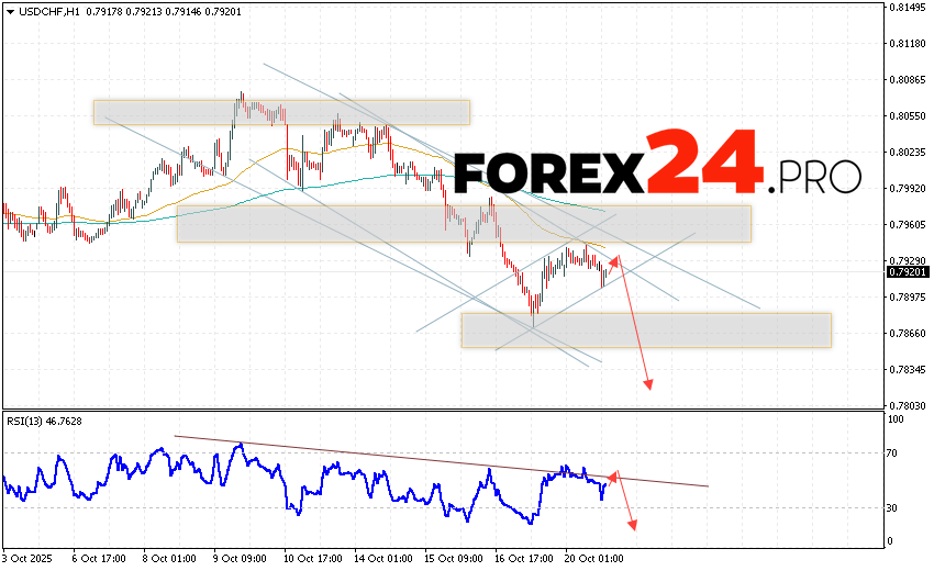 USD/CHF Forecast Dollar Franc for October 21, 2025 suggests an attempt to develop a bullish correction and test the resistance area near 0.7930. Subsequently, the USD/CHF currency pair is expected to continue to decline with a target below 0.7815. An additional signal favoring a decline in the USD/CHF pair would be a rebound from the trend line on the relative strength indicator. A strong rally and a breakout of 0.8005 would cancel out the downward scenario. This will indicate a breakout of the resistance level and a continuation of the rise of the pair with a potential target above the level of 0.8185.