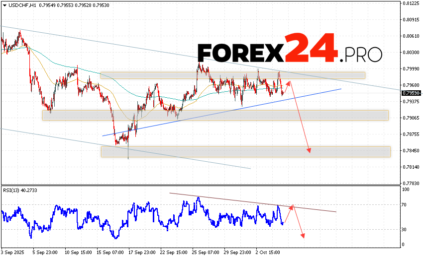 USD/CHF Forecast Dollar Franc for October 7, 2025 suggests an attempt to develop a bullish correction and test the resistance area near 0.7965. Further decline in the USD/CHF currency pair is then expected, with a target below 0.7855. A rebound from the trend line on the relative strength indicator (RSI) would be an additional signal in favor of a decline in the USD/CHF pair. A strong rally and a breakout of 0.8035 would cancel this downward trend. This will indicate a breakout of the resistance level and a continuation of the rise of the pair with a potential target above the level of 0.8215.