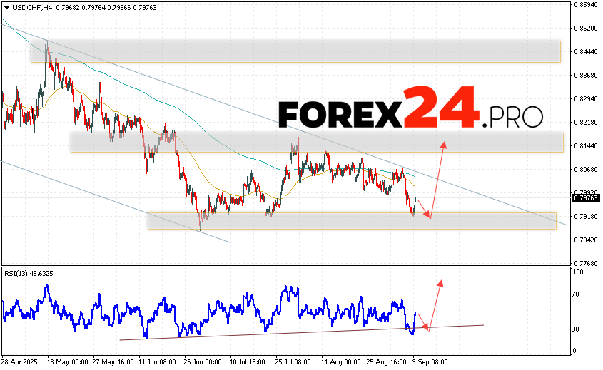 USD/CHF Forecast Dollar Franc for September 10, 2025 suggests an attempt to develop a bearish correction and test the support area near the level of 0.7925. Further, the continuation of the growth of the USD/CHF currency pair with a target above the level of 0.8145. An additional signal in favor of the rise of the Dollar Franc pair will be a rebound from the trend line on the relative strength indicator. The cancellation of the growth option will be a fall and a breakout of the 0.7835 area. This will indicate a breakout of the support level and a continuation of the fall of the pair with a potential target below the level of 0.7665.