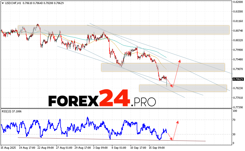 USD/CHF Forecast Dollar Franc for September 18, 2025 suggests an attempt to develop a bullish correction and test the support area near 0.7825. Further growth is expected for the USD/CHF pair, with a target above 0.7945. An additional signal in favor of an uptrend for the USD/CHF pair would be a rebound from the trend line on the relative strength indicator. A decline and a breakout of 0.7785 would cancel the uptrend. This would indicate a breakout of the support level and a continued decline in the pair, with a potential target below 0.7585.