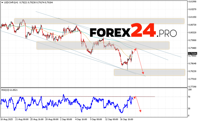 USD/CHF Forecast Dollar Franc for September 19, 2025 suggests an attempt to develop a bullish correction and test the resistance area near 0.7945. Further decline in the USD/CHF currency pair is then expected, with a target below 0.7805. A rebound from the trend line on the relative strength indicator (RSI) would be an additional signal for a decline in the USD/CHF pair. A strong rally and a breakout of 0.7995 would cancel out the downside scenario. This would indicate a breakout of the resistance level and continued growth, with a potential target above 0.8215.
