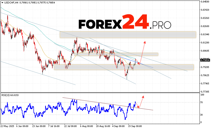 USD/CHF Forecast Dollar Franc for September 26, 2025 suggests an attempt to develop a bearish correction and test the support area near 0.7935. Further growth in the USD/CHF currency pair is expected, with a target above 0.8135. A rebound from the trend line on the relative strength indicator (RSI) would be an additional signal in favor of an uptrend in the USD/CHF pair. A decline and a breakout of 0.7855 would cancel out the upside. This will indicate a breakout of the support level and a continuation of the pair’s decline with a potential target below the level of 0.7695.