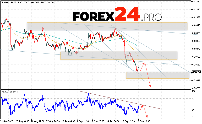 USD/CHF Forecast Dollar Franc for September 9, 2025 suggests an attempt to develop a bullish correction and test the resistance area near the level of 0.7955. Further, the continuation of the fall of the USD/CHF currency pair with a target below the level of 0.7875. An additional signal in favor of a decline in the Dollar Franc pair will be a rebound from the trend line on the relative strength indicator. The cancellation of the fall option will be a strong growth and a breakout of the 0.8045 area. This will indicate a breakout of the resistance level and a continuation of the rise of the pair with a potential target above the level of 0.8235.