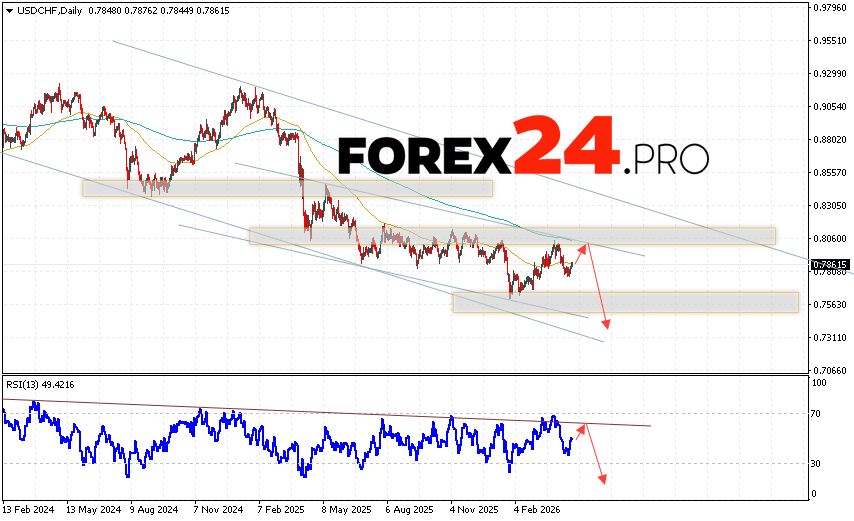 USD/CHF Weekly Forecast April 27 – May 1, 2026 suggests an attempt to develop a bullish correction and a test of the resistance level near the 0.7965 area. Then, the USD/CHF pair continues to fall to the area below the level of 0.7345. A test of the trend line on the relative strength index (RSI) will support the fall. Cancellation of the option to reduce USD/CHF will be a breakdown of the resistance area and closing of quotes above the level of 0.8165. This will indicate a continuation of the pair’s rise with a potential target above the level of 0.8375.