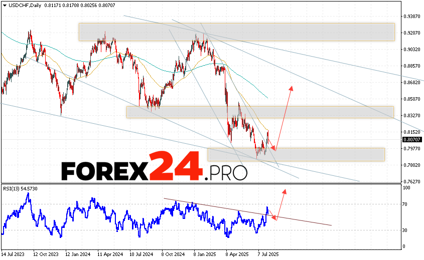 USD/CHF Weekly Forecast August 4 — 8, 2025 suggests an attempt to develop a decline and test the support level near the 0.7985 area. Then, the USD/CHF pair will continue to grow to an area above the 0.8685 level. The test of the trend line on the relative strength indicator will support the rise. A breakout of the support area and a close below 0.7665 will cancel the USD/CHF growth scenario. This will indicate a continuation of the pair’s decline with a potential target below 0.7225.