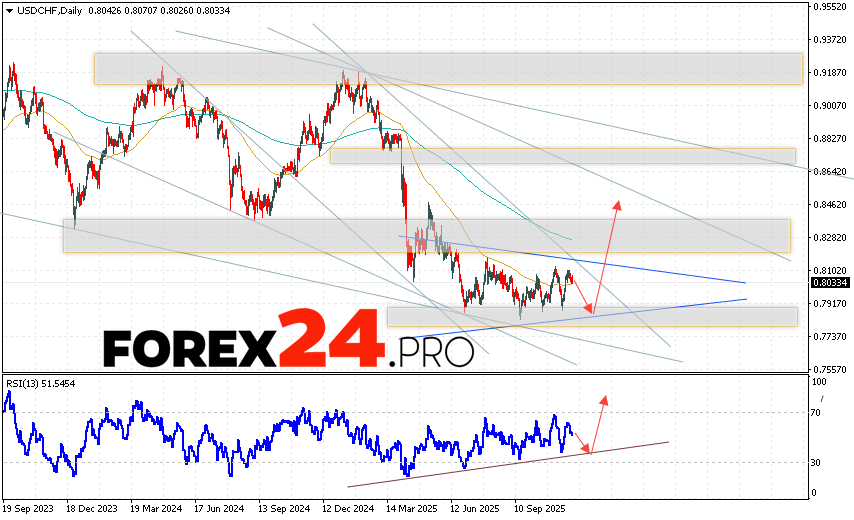 USD/CHF Weekly Forecast December 1 – 5, 2025 suggests an attempt to develop a bearish correction and a test of the support level near 0.7905. Then, the USD/CHF pair will continue to rise above 0.8465. A test of the trend line on the relative strength indicator (RSI) would support an upside move. A breakout of the support area and a close below 0.7725 would invalidate the USD/CHF upside. This would indicate continued decline, with a potential target below 0.7335.