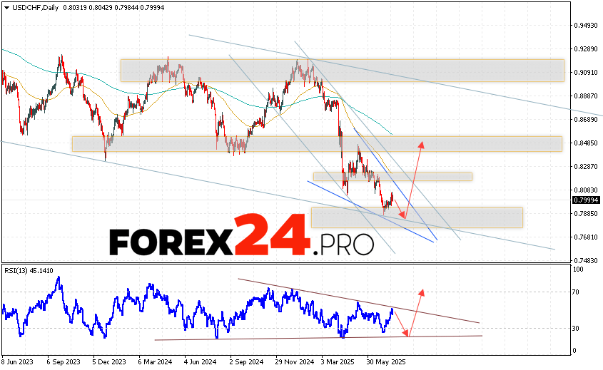 USD/CHF Weekly Forecast July 21 — 25, 2025 suggests an attempt to develop a decline and test the support level near the 0.7845 area. Then, the USD/CHF pair will continue to grow to the area above the 0.8485 level. The test of the trend line on the relative strength indicator will support the rise. A breakout of the support area and a close below 0.7645 will cancel the USD/CHF growth scenario. This will indicate a continuation of the pair’s decline with a potential target below 0.7235.