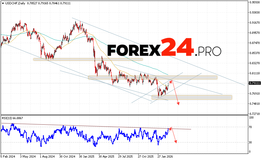 USD/CHF Weekly Forecast March 16 – 20, 2026 suggests an attempt to develop a bullish correction and a test of the resistance level near the 0.8005 area. Subsequently, the USD/CHF pair will continue to decline below 0.7485. A test of the trend line on the relative strength indicator (RSI) would support a decline. The USD/CHF downside scenario would be cancelled if the pair breaks the resistance area and closes above 0.8135. This would indicate continued upside movement with a potential target above 0.8405.