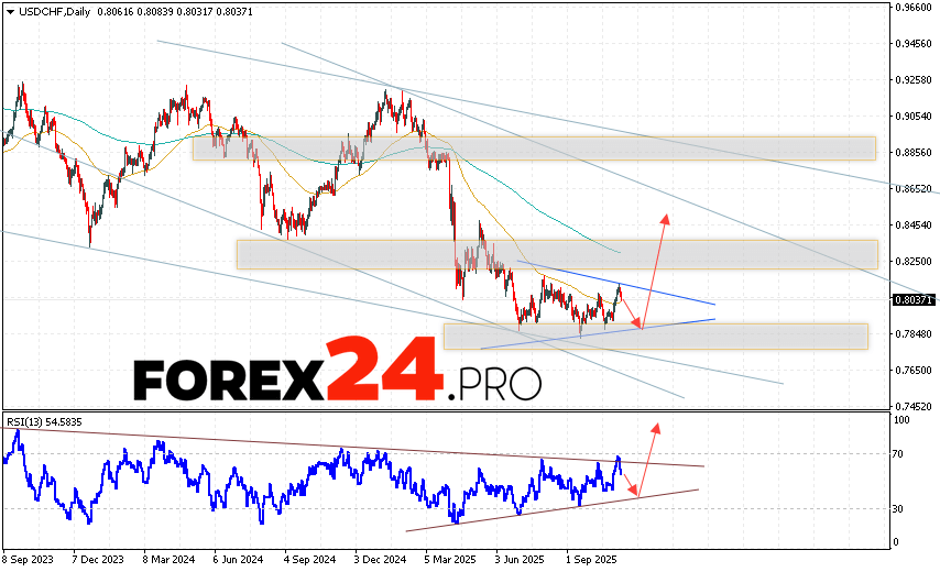 USD/CHF Weekly Forecast November 10 – 14, 2025 suggests an attempt to develop a bearish correction and a test of the support level near the 0.7865 area. The USD/CHF pair is then expected to continue rising above 0.8455. A test of the trend line on the relative strength indicator (RSI) would support this upward trend. A breakout of the support area and a close below 0.7665 would invalidate the USD/CHF uptrend. This would indicate continued decline with a potential target below 0.7245.