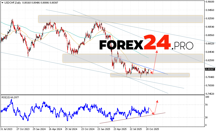 USD/CHF Weekly Forecast November 3 – 7, 2025 suggests an attempt to develop a bearish correction and a test of the support level near the 0.7865 area. The USD/CHF pair is then expected to continue rising above 0.8455. A test of the trend line on the relative strength indicator (RSI) would support the upside. A breakout of the support area and a close below 0.7675 would invalidate the USD/CHF upside. This would indicate continued decline with a potential target below 0.7255.