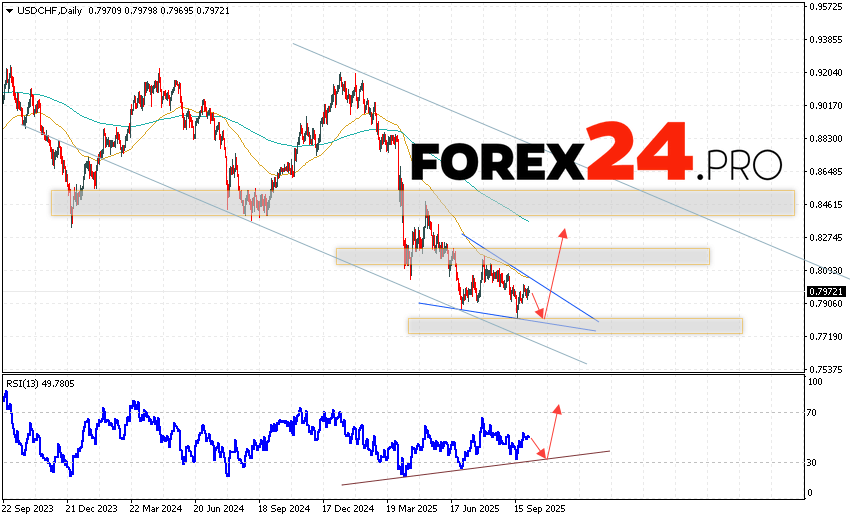 USD/CHF Weekly Forecast October 6 — 10, 2025 suggests an attempt to develop a bearish correction and a test of the support level near the 0.7835 area. The USD/CHF pair is then expected to continue rising above 0.8335. A test of the trend line on the relative strength indicator (RSI) would support this upward trend. A breakout of the support area and a close below 0.7675 would invalidate the USD/CHF upside. This would indicate continued decline with a potential target below 0.7375.