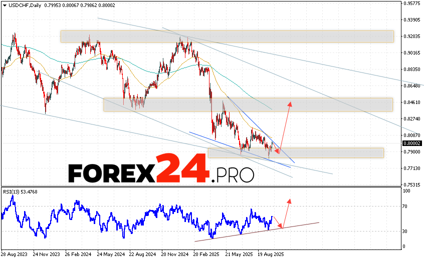 USD/CHF Weekly Forecast September 29 — October 3, 2025 suggests an attempt to develop a bearish correction and a test of the support level near 0.7865. Subsequently, the USD/CHF pair will continue to rise above 0.8465. A test of the trend line on the relative strength indicator (RSI) will support the upside. A breakout of the support area and a close below 0.7675 will cancel out the USD/CHF upside scenario. This will indicate a continued decline with a potential target below 0.7375.