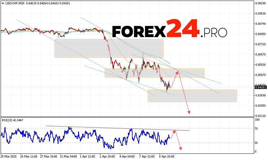 USDCHF Forecast Dollar Franc for April 10, 2025 suggests an attempt to develop a bullish correction and test the resistance area near the 0.8505 level. Further, the continuation of the fall of the USD/CHF currency pair with a target below the 0.8245 level. An additional signal in favor of the decline of the Dollar Franc pair will be a rebound from the trend line on the relative strength indicator. The cancellation of the scenario with the fall will be a strong growth and a breakout of the 0.8605 area. This will indicate a breakout of the resistance level and continued growth of the pair with a potential target above the level of 0.8765.